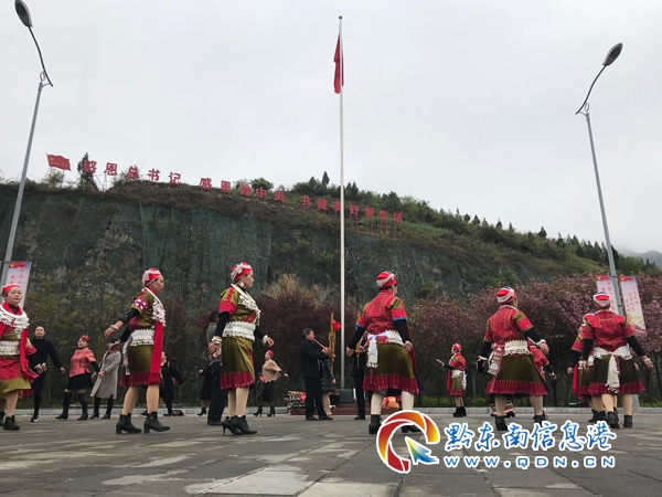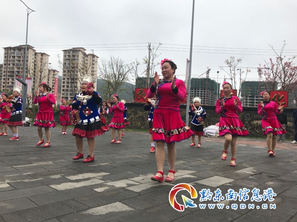 圖為4月4日,凱里市開懷街道上馬石社區移民群眾在民族文化廣場,歡跳苗族板凳舞。