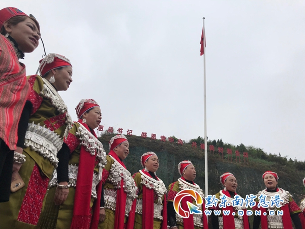 圖為4月4日,凱里市開懷街道上馬石社區移民群眾在民族文化廣場,合唱苗歌謳歌新生活。