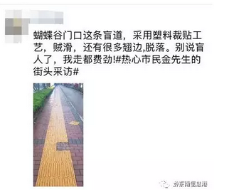 對此,市政養護處的工作人員司德標告訴記者,該橡膠盲道是蝴蝶谷開發商在建設過程中未設置有盲道,開發商在移交給城市管理局管理時,沒有通過驗收,隨后便要求開發商整改,開發商在整改過程中則采用粘貼橡膠盲道的方法補救。”然而,橡膠盲道怕碾壓、怕水。“人走在橡膠盲道上面是沒有問題的,但由于鋪設時間過長,除了行人在行走外,還有一些車輛在橡膠盲道上拖移,經風吹日曬等原因導致盲道受損。”司德標稱,這個情況他們將會立馬反饋給蝴蝶谷開發商,不日將對盲道進行修補。