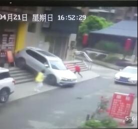 監控畫面顯示,事發當日下午16時52分,同行的市民四人行走在人行道上,當四人剛好走到一輛橫停在路邊的白色車輛后方時,車輛突然倒車駛上了人行道,撞向正在行走的四人,四人見狀急忙退讓躲避,最后車輛沖上了人行道一側的五階臺階,一位身穿深色上衣的路人來不及避讓,被車輛撞倒在地壓在車下,車輛停下后,其余三人連忙跑開遠離車輛,此時肇事車輛的副駕駛座上的人立馬下車查看。