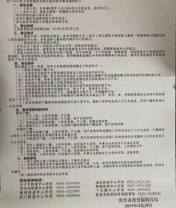 根據《中華人民共和國義務教育法》,《貴州省義務教育條例》等文件精神,為保障適齡兒童少年按時入學,現將凱里城區(城西街道、大十字街道、西門街道、灣溪街道、洗馬河街道、鴨塘街道、貴州凱里經濟開發區的白午地區)2019年義務教育階段招生登記相關事項通知如下: