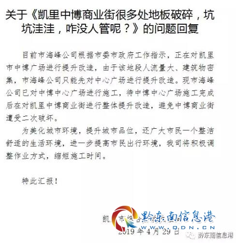 針對(duì)以上問題,凱里市綜合行政執(zhí)法局針對(duì)在4月29日,對(duì)中博步行街路面出現(xiàn)的問題做出答復(fù),凱里市綜合行政執(zhí)法局表示,目前市海峰公司根據(jù)市委市政府工作指示,正在對(duì)凱里市中博廣場(chǎng)進(jìn)行提升改造,由于該地段人流量大、建筑物密集,市海峰公司只能先對(duì)中心廣場(chǎng)進(jìn)行提升改造�,F(xiàn)市海峰公司已對(duì)中博中心廣場(chǎng)進(jìn)行施工,待中博中心廣場(chǎng)施工完成后在對(duì)凱里中博商業(yè)街進(jìn)行整體提升改造,避免中博商業(yè)街遭受二次破壞。