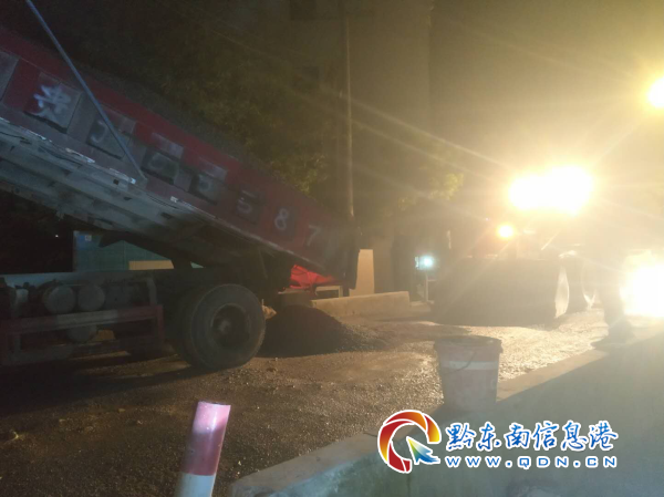 因白天該道路車輛量過大,為保證施工安全以及來往車輛的正常通行,補修工作從晚上22時開始,本次施工共使用了兩個拌合站;運輸車輛15輛次;出動裝載機2臺;砂石225立方米,出動施工人員12余人。