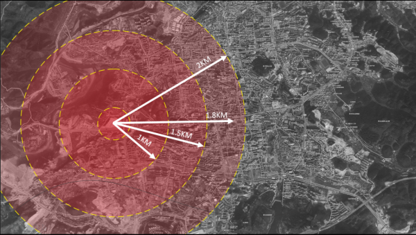 1KM內環繞大片居民住宅區和學校,居住區集中,人口密集,