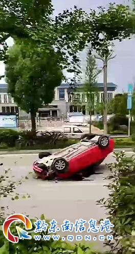 事發(fā)時,紅色轎車從凱里市區(qū)駛往三棵樹方向,至事發(fā)地點時,撞上了運(yùn)行中的四輪電頻車,致其駕駛員被撞飛,后摔落在地面上。紅色轎車則翻滾向前,最終四“腳”朝天躺倒在路上,司機(jī)受傷,但還能從車?yán)锱莱鰜怼?/p>