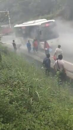 5月25日,一輛201路公交車(chē)行至凱里虎莊大坳處時(shí)突然冒出煙霧,可把一車(chē)的乘客嚇壞了。