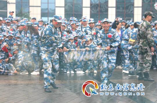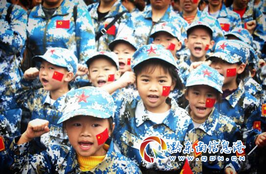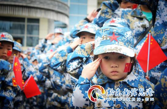 活動當天,兩個幼兒園的小朋友以及各位家長們均身著亮麗的迷彩服,頭戴軍帽,手執國旗,一個個爭相扮演著合格的“小兵”和“老兵”。