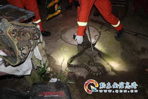 消防指戰員到達現場后,經詢問報警人得知,當時報警人在睡夢中被狗叫聲驚醒,于是到院子中查看情況,定睛一看,原來是院中出現了一條一米多長的蛇,報警人無從下手又擔心蛇會襲擊自己和家人,隨即撥打了119報警電話求助。