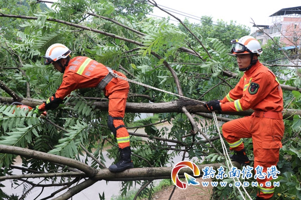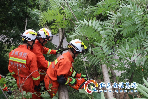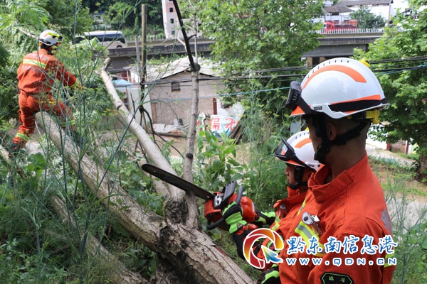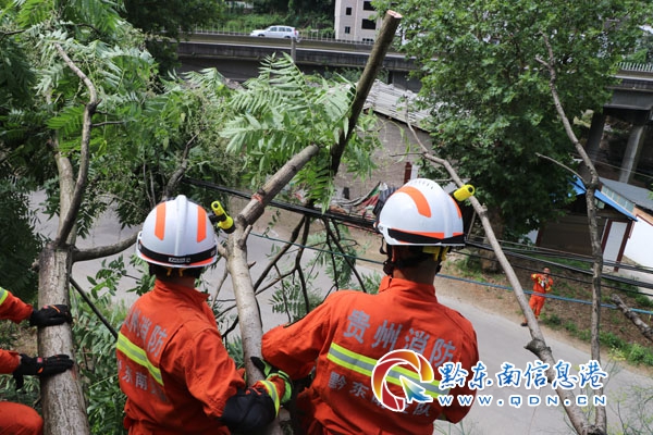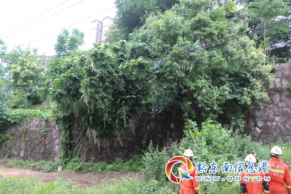 本網訊 6月20日,凱里市消防大隊特勤中隊接到報警,凱里市凱旋廠有一棵大樹被狂風吹到,并且壓在了路邊的電線上,威脅人民群眾安全。接到報警后,特勤中隊迅速出動一個搶險救援編隊前往排除安全隱患。