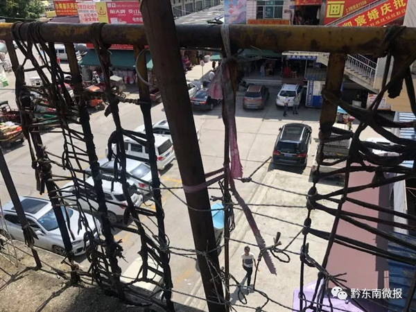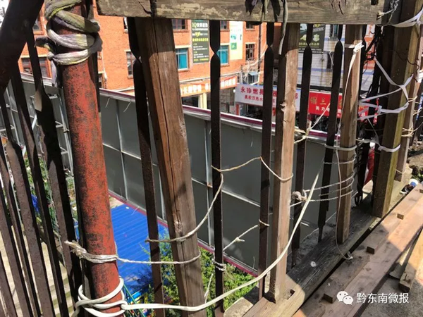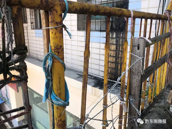 6月19日,記者來到裕華商住樓實地調查。從該樓一層上到二層,記者發現樓梯兩邊的護欄剛剛油漆過,空檔大的地方還加上了鋼筋。從二層上三層,以及三層露天陽臺,情況就不同了,猶如兩個世界,兩邊護欄的鋼筋早已銹跡斑斑,用手輕輕一搖就掉鐵屑。記者現場觀察,約三分之一的護欄鋼條已腐蝕斷裂或脫落,留下較大空間,居民在露天陽臺用電線、鐵絲、塑料繩做了粗糙的修補,但只是臨時措施,而樓梯處未做任何修補。記者嘗試將頭伸進空隙,發現還有多余的空間。