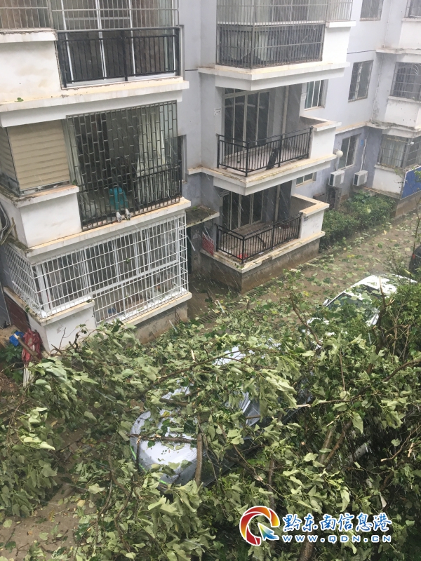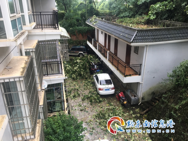 在凱里市開發(fā)區(qū)財富黔城小區(qū),附近兩棵大樹樹枝被突如其來的狂風刮斷,導致停在小區(qū)內(nèi)的部分車輛被掉下來的樹枝壓蓋,造成不同程度損傷。