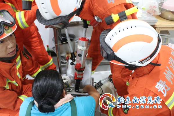 特勤中隊到達現場后,經過仔細觀察發現,女子的右手食指和中指,被牢牢卡在了面條機的兩個滾筒之間。了解情況后,中隊指戰員決定用電動擴張器直接把面條機擴開,但是由于兩個滾筒之間縫隙太小,而擴張器體積過大,沒有操作空間。隨后,指戰員決定迅速將面條機上的各個部件拆卸下來,再使用擴張器從面條機下面進行擴張,經過指戰員近二十分鐘的緊張救援,該女子的手指被成功取出。