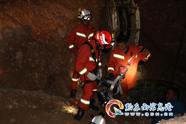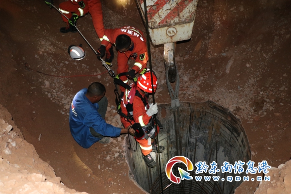 了解情況后,指揮員帶領救援人員攜帶防護裝備,利用安全吊帶及工地塔吊深入井底,在接近被困人員后,救援人員一邊安撫被困人員情緒,一邊詢問受傷情況,得知被困人員手部、頭部受傷,自己無法活動。救援人員利用安全吊帶穿戴于被困人員身上,做好安全防護后,井上救援人員拉動保護繩索及塔吊拉繩,合力將被困人員向井口拉升。