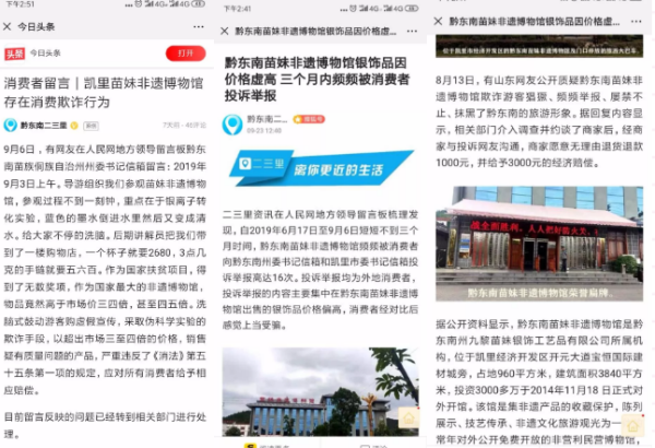 相關平臺在推文中提到,黔東南苗妹非遺博物館頻頻被消費者向黔東南州委書記信箱和凱里市委書記信箱投訴舉報高達16次。投訴舉報均為外地消費者,投訴舉報的內容主要集中在黔東南苗妹非遺博物館出售的銀飾品價格偏高,消費者經對比后感覺上當受騙了。