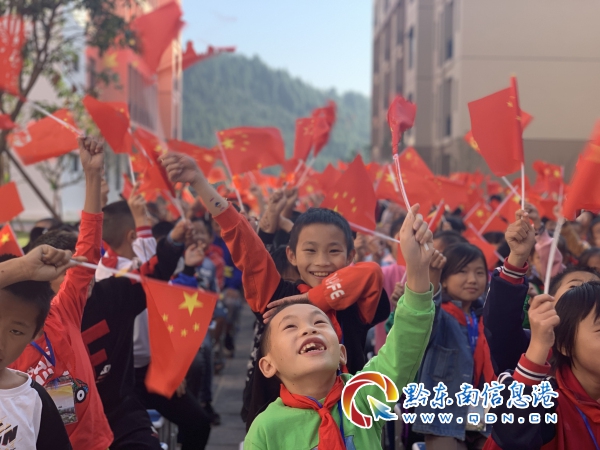 在移民安置點嶄新的校園操場上,同學們揮舞著小國旗合唱《我和我的祖國》并與國旗合影,同祝祖國母親70周年生日快樂。