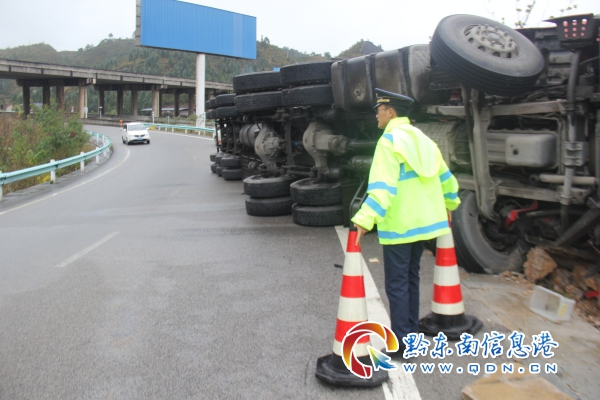 當日14時許,凱里高速公路管理處丹寨路政執法大隊日常路政巡查到 S62 余冊高速 K89+000 互通匝道丹寨往凱里方向時,發現在匝道彎道處熱氣升騰,一輛滿載木材的六軸貨車側翻在匝道左幅,車頭已經側滑出路面,且駕駛室位置已經變形,側翻的貨車旁不時有車輛駛過,情況十分危險。
