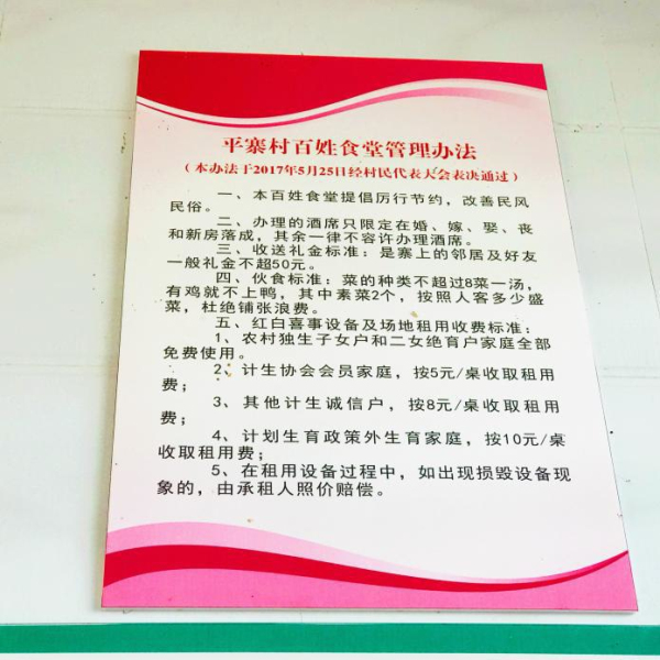 紅白喜事設(shè)備及場地要按照相關(guān)標(biāo)準(zhǔn)來收費(fèi)?楊正斌介紹:" 在我們村里,農(nóng)村獨(dú)生子女戶和二女絕育戶家庭全部免費(fèi)使用;計生協(xié)會會員家庭,按5元/桌收取租用費(fèi);計劃生育政策外生育家庭,按10元/桌收取租用費(fèi);其他家庭,按8元/桌收取租用費(fèi)。"