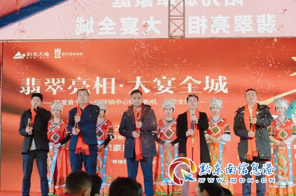 11時吉時已到,在主持人的隆重介紹下,城市總經理黃友會;策劃部負責人張天驕;銷售部負責人郭新秋;工程部負責人童亞飛;物業部負責人何強生為亮相儀式進行剪彩。在一聲聲禮炮聲中,我們祝愿陽光翡翠豪庭銷量如虹,一飛沖天,為凱里提供更好的人居,同時也給凱里的人們帶來更加美好的生活。
