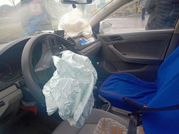 受損的出租車(chē)在記者趕到時(shí),已退到了鴨塘大橋旁邊的道路上,車(chē)輛保險(xiǎn)杠接近脫落。駕駛室內(nèi),正、副駕駛座上的安全氣囊均已彈出。