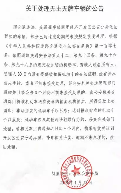 因交通違法、交通肇事被凱里經(jīng)濟開發(fā)區(qū)公安分局依法暫扣的車輛,部分已超過法定期限未按規(guī)定接受處理。根據(jù)《中華人民共和國道路交通安全法實施條例》第一百零七條:依照道路交通安全法第九十二、第九十五條、第九十六條、第九十八條的規(guī)定被扣留的機動車,駕駛?cè)嘶蛘咚腥恕⒐芾砣?0日內(nèi)沒有提供被扣留機動車的合法證明,沒有補辦相應手續(xù),或者不前來接受處理,經(jīng)公安機關(guān)交通管理部門通知并且經(jīng)公告3個月仍不前來接受處理的,由公安機關(guān)交通部門將該機動車送有資格的拍賣機構(gòu)拍志,所得價款上交國庫;非法拼裝的機動車予以拆除;達到報廢標準的機動車予以報廢;機動車涉及其他違法犯罪行為的,移交有關(guān)部門處理。請相關(guān)車主自通知之日起三個月內(nèi),攜帶有效憑證到開發(fā)區(qū)公安分局辦理、補齊相關(guān)手續(xù),逾期不來辦理的,依法處理。
