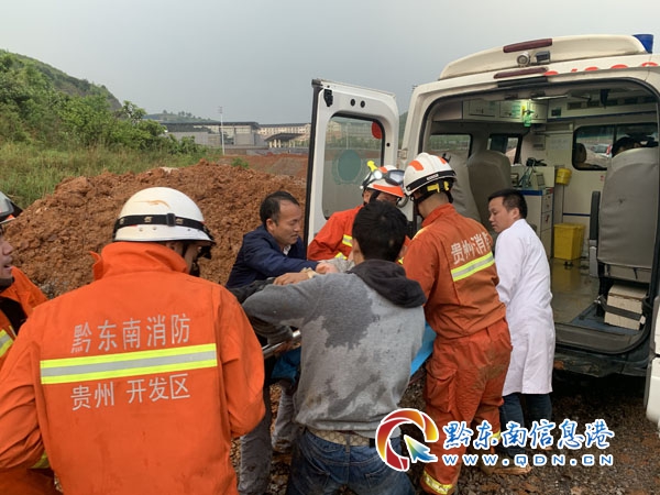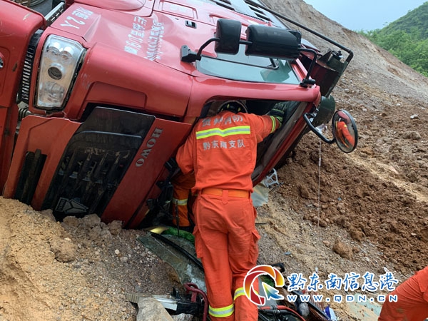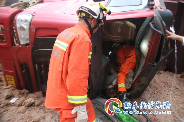 本網訊 4月24日16時12分,凱里市開發區大隊接到報警稱:凱里經濟開發區農博會建筑工地,一輛大貨車不慎滑下坡底,有人員被困,情況緊急。接到報警后,開發區大隊立即出動一個搶險救援編隊前往處置。