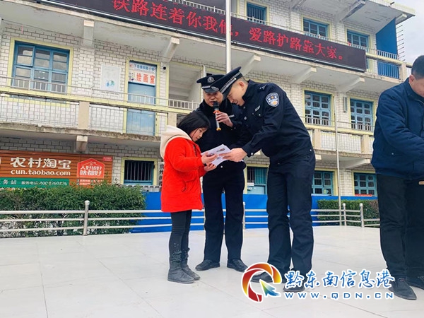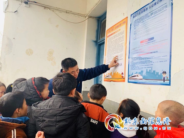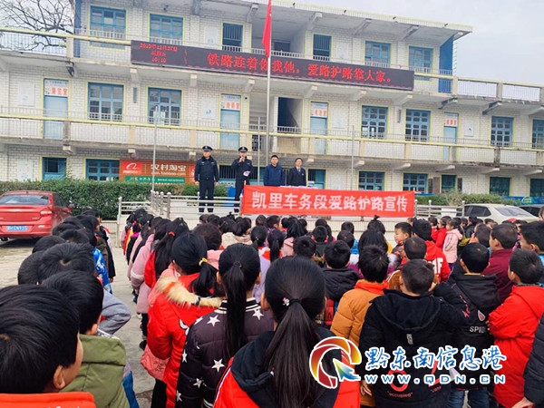 本網訊  12月27日上午,凱里南站、凱里南派出所、凱里南工務段以及凱里經濟開發區護路辦公室走進銅鼓小學,利用課間時間對全校256名學生及13名老師進行了鐵路護路知識教育宣傳。