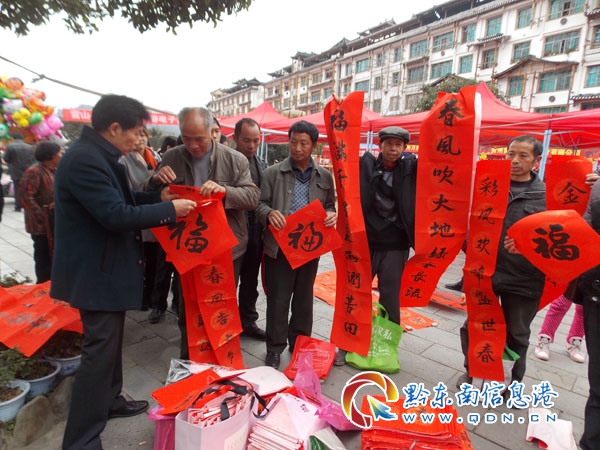 據了解,該縣書法家協會的12位書法老師經過20天的努力,共寫成大小春聯12000余副,免費贈送各族群眾。這是雷山縣自2009年以來規模最大、送春聯最多的一次。(張希才 攝影報道)