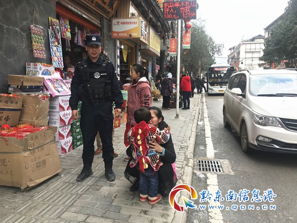 12時,雷山特巡警大隊接到李女士報警稱小孩楊某某在丹江鎮大十字走失,求情警察幫忙尋找。接到警情后,民警迅速通過對講機呼叫大十字網格巡邏隊員在大十字尋找。巡邏隊員一方面安撫李女士情緒并詳細了解走失小孩體貌特征、衣服著裝,一方面在大十字附近尋找,由于臨近春節,轄區購買年貨人數較多,導致尋找難度增大,為了盡快找到小孩,雷山特警出奇招,尋找時一邊呼喊小孩名字,一邊觀看是否有哭泣的小孩,經過10多分鐘的努力尋找后,巡邏隊員在大十字附近看到一名哭泣的兒童經核實為走失小孩楊某某,求助家屬李女士聞訊趕至巡邏隊員旁,看到自己的孩子后,李女士眼含淚水,緊緊抱著其小孩,不停的向巡邏隊員致謝!