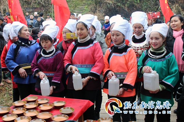 鋪開(kāi)紅毯喜迎接,出閣金花歸鄉(xiāng)來(lái)。當(dāng)天,浩浩蕩蕩的姑媽隊(duì)伍,在不絕于耳的鞭炮聲中,踏著蘆笙舞步,沿水泥路,蜿蜒而上,在一路敘舊話新,一路歡歌笑語(yǔ)中闖過(guò)了“不管你喜歡不喜歡喝,也要喝……”水家人“高山流水”的攔門(mén)酒。