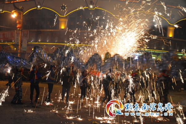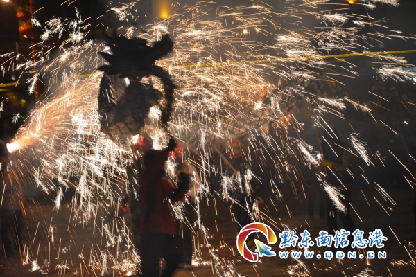 在元宵節(jié)的晚上19點(diǎn)過鐘,記者在縣城采訪看到,500余名青壯年將30多條“龍”牽引到大街小巷各家各戶和門市祝賀元宵繞行ᅳ圈,到了20點(diǎn)20分,他們把“龍”進(jìn)入大十字中心街內(nèi),這時(shí),數(shù)十名噓花者早已在大十字等候“龍”的到來,只見舞龍者高喊“龍”來了!“龍”來了!!”,噓者們手持花筒蜂擁而致,點(diǎn)燃自己手上的花筒,發(fā)出“呼呼”的噴射聲直指龍頭、龍身,頓時(shí),火光滔天,猶如波浪,一浪翻過一浪,舞龍者赤身裸背在火花四射中舉著龍燈前進(jìn),直至龍頭和龍身被燒得面目全非。圖為在雷山縣城大十字噓花鬧元宵的場景。(張希才)