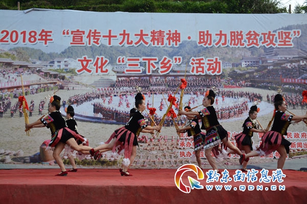 圖為2018年5月1日雷山縣利用黃里爬坡節“宣傳十九大精神·助力脫貧攻堅”文化“三下鄉”活動吹笙表演的場景