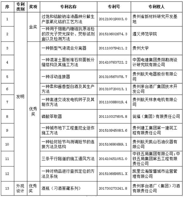 2017-2018年度貴州省專利獎預獲獎名單