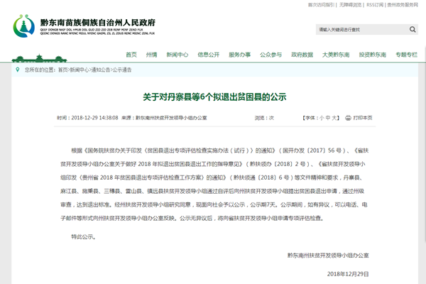 近日,黔東南州人民政府網(wǎng)站發(fā)布了《關(guān)于對(duì)丹寨縣等6個(gè)擬退出貧困縣的公示》。
