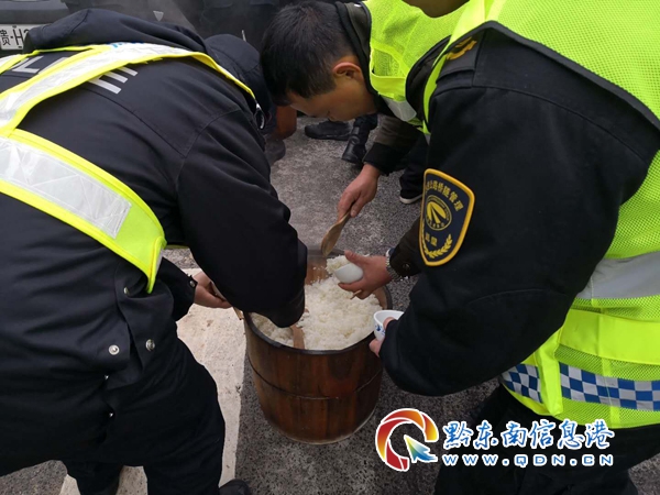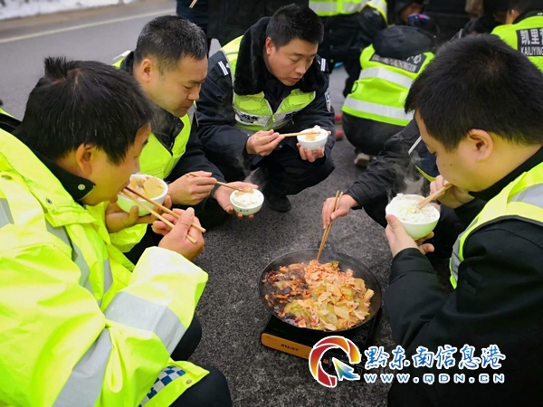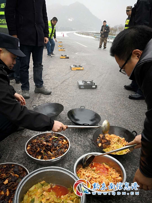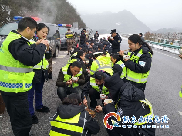為了保證轄區道路的正常通行,高速二大隊聯合轄區“一路多方”對轄區道路多次采取撒鹽除冰、鏟車除冰等措施,但在黃平縣境內的余安高速公路42至45公里處,由于該地段處于風口,連續橋梁路段,道路凝凍特別嚴重,在撒鹽除冰、鏟車除冰無果后,高速二大隊主動聯系黃平縣委縣政府,得到了縣委縣政府的大力支持,在黃平縣委縣政府的領導下,于2019年1月3日上午7時,組織高速公路“一路多方”、縣政府、縣公安局特巡警大隊、縣應急辦、縣武裝部等部門80余人到尚處于交通管制的余安高速公路42至45公里處開展除冰保暢工作,為了搶通道路,80多人的中午飯派專人送到高速公路上,當天1時在高速公路上擺開飯桌,猶如苗家的“長桌宴”,隊員匆匆用完餐,馬上又投入戰斗,經過連續7各小時不間斷的努力,午飯終于在下午14時許恢復了道路正常通行。(廖忠彥 唐光新)