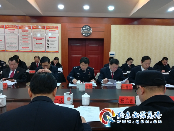 會上,黔東南州公安局、黔東南州檢察院、黔東南州法院、黔東南州司法局四家單位分別報告了在2018年州十四屆人民代表大會第二次會議上政府工作報告涉及的重點工作和“兩院”報告提出的重點工作的完成情況;部分州人大常委會委員、州人大內司委委員和州人大代表就這些工作的完成情況進行了有針對性的詢問,被詢問單位負責人及相關同志認真作了答詢。