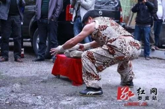 他說,“頭頂開石”是一場(chǎng)力學(xué)表演。以前賣塊鹽時(shí),鹽商把十斤八斤重的鹽塊放在手掌上,另一只手執(zhí)鐵錘將鹽塊擊碎,手無損傷。表演者節(jié)目表演時(shí),只要膽大,不論石塊放在身體什么地方都不會(huì)傷人,一點(diǎn)功夫沒有的人都能表演,這是根據(jù)力學(xué)原理進(jìn)行表演的一個(gè)民間特技節(jié)目。