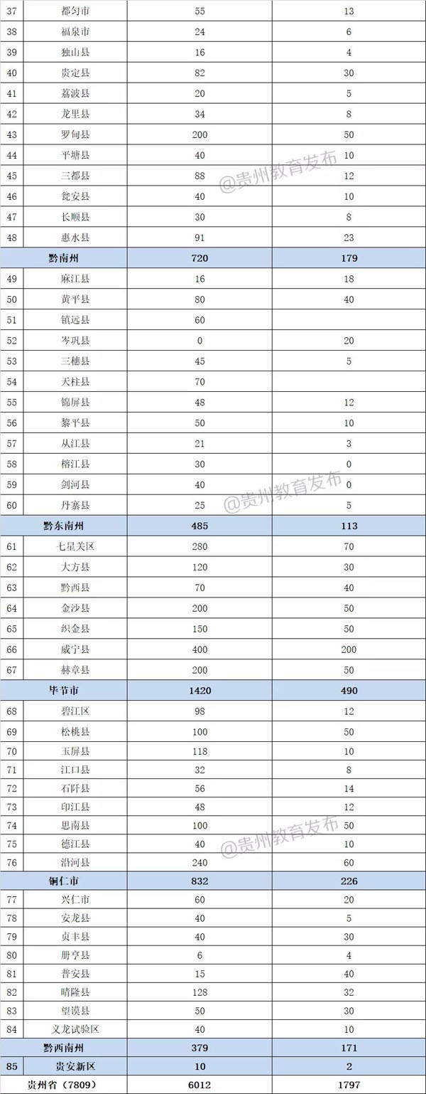 (二)2019年全省安排“特崗計(jì)劃”指標(biāo)7809名在云巖區(qū)等85個(gè)縣(市、區(qū)、特區(qū),下同),其中國(guó)家“特崗計(jì)劃”招聘6012名(含30名“碩師計(jì)劃”畢業(yè)生,下同);縣“特崗計(jì)劃”招聘1797名,具體分配指標(biāo)見(jiàn)下表。
