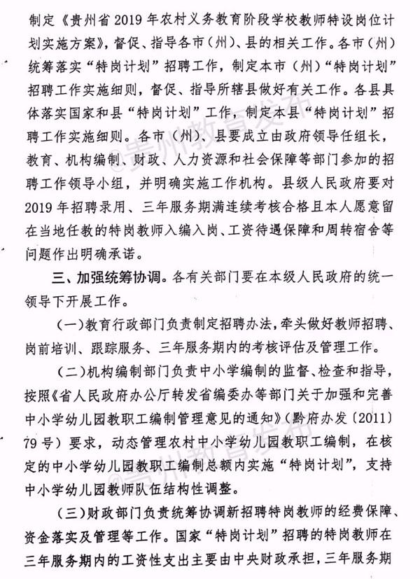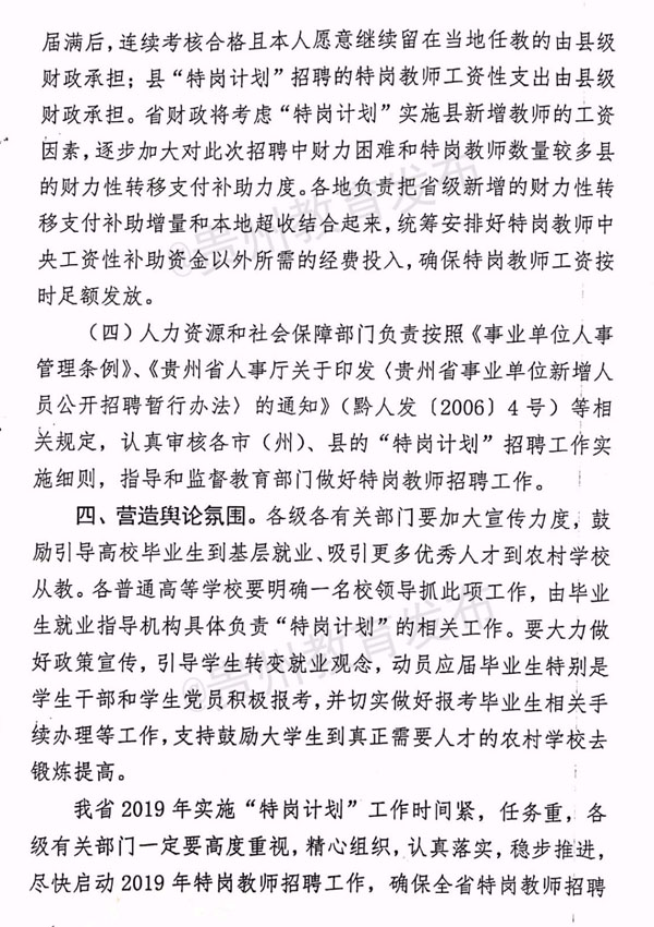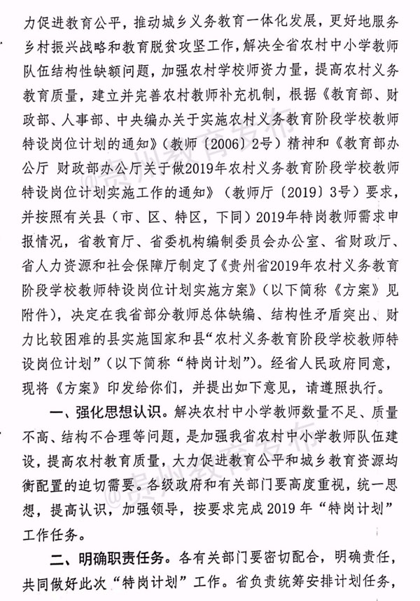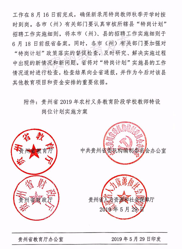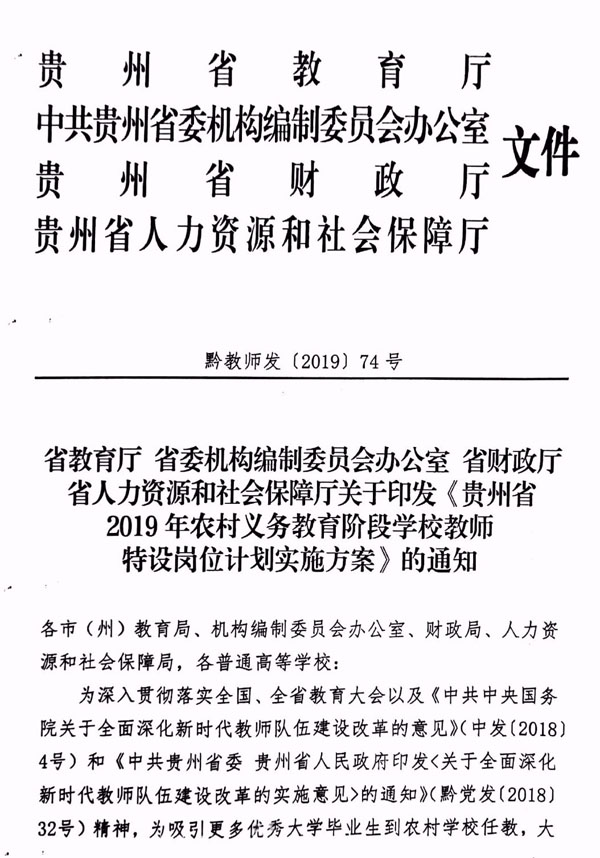 近日,省教育廳、省委機(jī)構(gòu)編制委員會(huì)辦公室、省財(cái)政廳、省人力資源和社會(huì)保障廳下發(fā)《關(guān)于印發(fā)<貴州省2019年農(nóng)村義務(wù)教育階段學(xué)校教師特設(shè)崗位計(jì)劃實(shí)施方案>的通知》,對(duì)我省2019年農(nóng)村義務(wù)教育階段學(xué)校教師特設(shè)崗位計(jì)劃實(shí)施相關(guān)工作進(jìn)行安排部署。