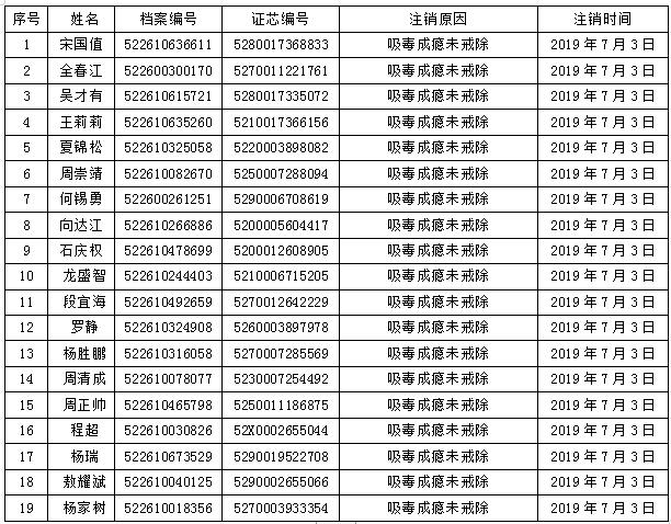 根據《公安部關于修改<機動車駕駛證申領和使用規定>的決定》(公安部第139號令)第七十七條之規定,機動車駕駛人具有被查獲有吸食、注射毒品后駕駛機動車行為,正在執行社區戒毒、強制隔離戒毒、社區康復措施,或者長期服用依賴性精神藥品成癮尚未戒除的車輛管理所應該注銷其機動車駕駛證。根據規定,現將因吸毒成癮未戒除被注銷的駕駛證信息公告如下:
