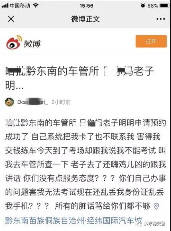 經查,2019年7月5日13時46分,新浪微博用戶Dcarexxx通過新浪微博發布的辱罵與誹謗公安機關的惡劣言論,發布人系機動車駕駛證考試學員王某仙(女)。