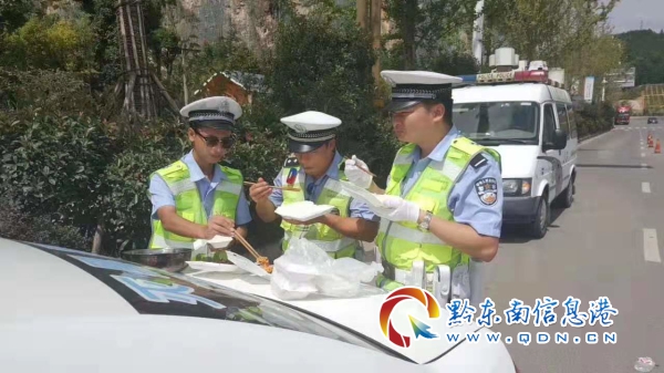楊生豪(右一)在崗點吃盒飯