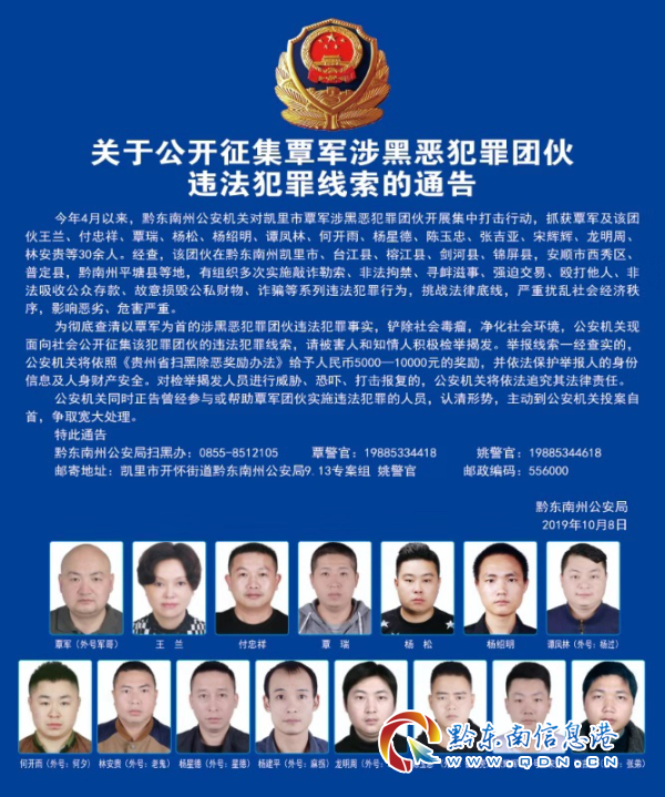 為徹底查清以覃軍為首的涉黑惡犯罪團伙違法犯罪事實,產出社會毒瘤,凈化社會環境,公安機關現面向社會發布《關于公開征集覃軍涉黑惡犯罪團伙違法犯罪線索的通稿》,請被害人和知情人積極檢舉揭發。