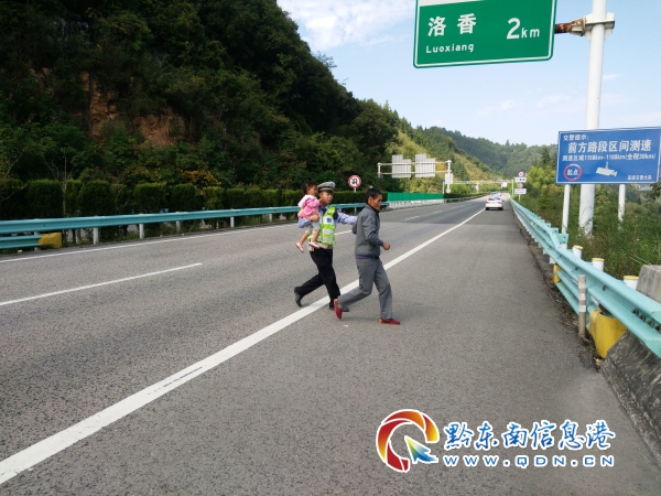 10月1日,貴州黔東南州公安局交警支隊高速六大隊民警巡邏至廈蓉高速從江縣境內的新寨路段時,發現老人抱著一小女孩跨過中央隔離欲橫穿高速,后方大量來車疾馳而過,情況十分危險,民警巡邏立即下車,快步上前懷抱小孩,拉住老人快步跑到應急車道上,然后用警車護送到家,及時消除了隱患,避免了意外發生。