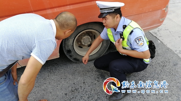 10月3日早上10點左右,貴州省黔東南州公安局交警支隊高速六大隊民警巡邏至黎平縣水口鎮境內歸近大橋路段時,發現前方一輛行駛的紅色客車車身向左側傾斜,車身極其不平衡,安全隱患很大。