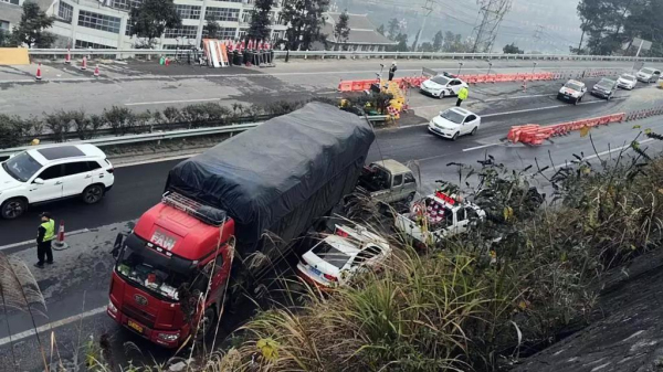 當(dāng)日早上5點(diǎn)30分左右,民警到達(dá)事故現(xiàn)場后發(fā)現(xiàn)一輛皖S籍重型貨車在滬昆高速公路劍河往臺江方向劍河收費(fèi)站兩公里處的施工路段碰撞護(hù)欄后沖到對面車道,導(dǎo)致交通中斷。于是,民警做好安全防護(hù)的同時,采用交替放行的方式保障道路正常通行,等待應(yīng)急救援單位進(jìn)行施救。