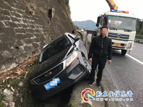 當黔東南州交警支隊高速一大隊三中隊民警趕到現場后,看到一輛黑色越野車,左側被卡在高速公路邊溝內無法動彈。此時應急救援部門已趕到現場維持秩序,車內的人員也都自行爬到車外,所幸車內四名人員均無大礙。