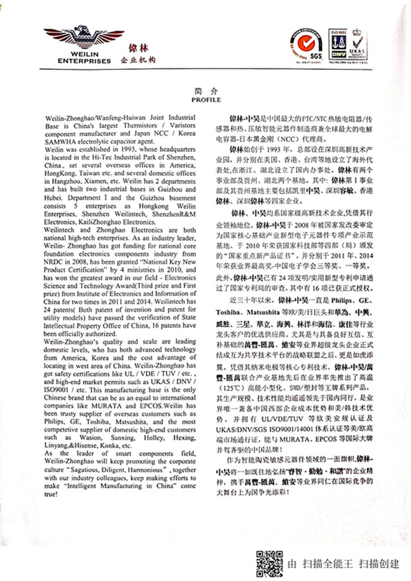 中昊是偉林企業于2001年在083軍工基地4325廠基礎上建立的中國最大的熱敏電阻器產業基地,系業界僅有的設立了省級技術中心的國家級高新技術企業,被國家發改委列為國家核心基礎產業新型電子元器件產業化專項重點資助項目。除上述規模優勢、國家資助優勢外,該產業基地還有中國西部企業用地用電用工優勢及成本優勢和中/美/韓技術優勢及國際高端市場優勢。迄今為止,業界唯有中昊擁有美國UL / 德國VDE安規認證及英國UKAS / 挪威DNV /瑞士 SGS ISO9001 / 14000 認證等全套國際高端市場通行證并早已成功打入日本東芝/松下(迄今為止一直是其全球唯一熱敏電阻器供應商)、荷蘭菲利浦(于2012年通過其全球EICC認證)、美國GE、韓國三星/LG(通過韓國DSC OEM方式)等國際高端市場。