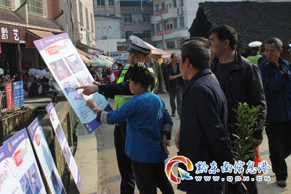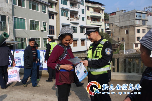 民警向前來趕集群眾發(fā)送交通安全宣傳單