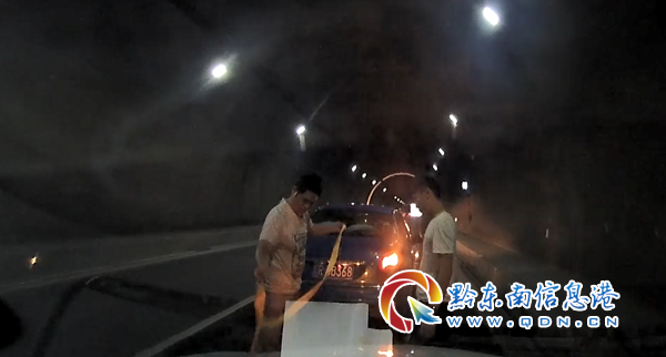 本網訊 2019年6月23日, 在廈蓉高貴州省榕江縣境內的黃蒙隧道內,有一輛車因燃油耗盡拋錨在隧道內,另外一輛轎車用軟繩牽引施救,現場險象環生,所幸的是險情被巡邏至此的貴州省黔東南州公安局交警支隊高速六大隊一中隊巡邏民警及時發現,并立即制止其違法行為,安全護送出隧道外,險情才得以消除。