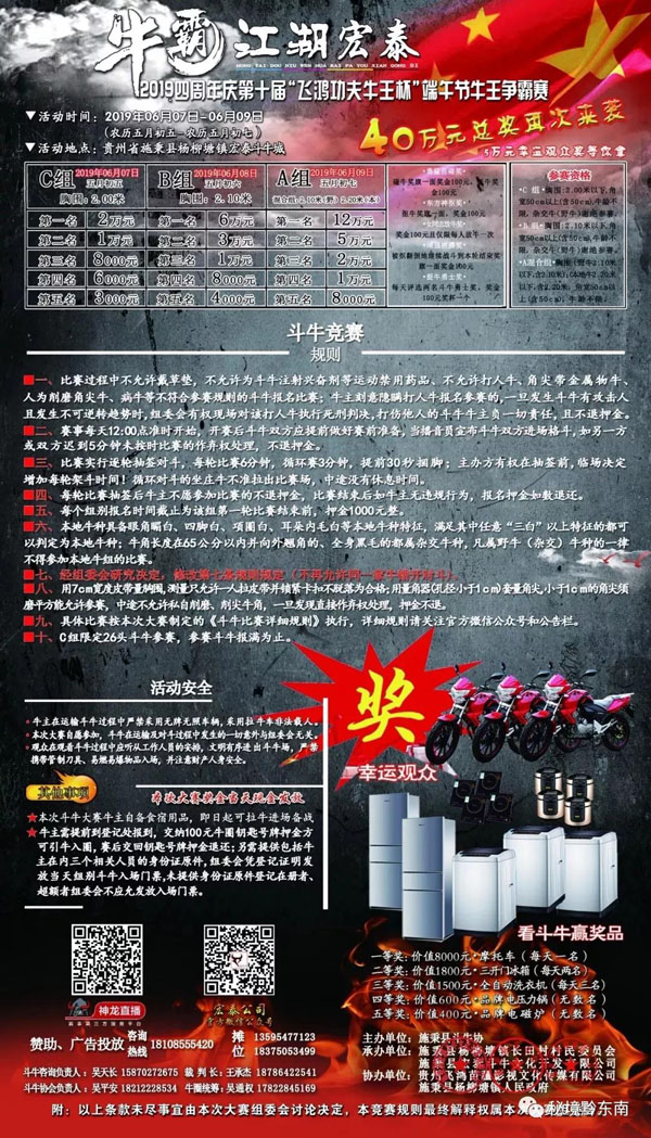 為慶祝端午佳節(jié),弘揚(yáng)民族傳統(tǒng)節(jié)日,豐富廣大群眾精神文化生活,發(fā)掘民間民族文化精髓,傳承民族優(yōu)良文化傳統(tǒng);促進(jìn)斗牛文化旅游產(chǎn)業(yè)蓬勃發(fā)展,打造苗疆優(yōu)秀旅游品牌商標(biāo),施秉縣楊柳塘鎮(zhèn)長田村攜手施秉縣宏泰斗牛文化開發(fā)有限公司;貴州飛鴻苗疆影視文化傳媒有限公司;貴州明洋食品有限公司;中視頻道(北京)國際影視文化傳媒。擬定2019年06月07日(農(nóng)歷五月初五)至2019年06月09日(農(nóng)歷五月初七)舉辦第十屆“飛鴻功夫牛王杯”端午節(jié)牛王爭霸賽暨玉夢酸湯大型群星演唱會,現(xiàn)將活動詳細(xì)安排如下: